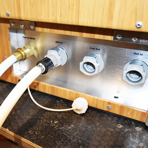 When Galleys and Wheel Well Cabinets are ordered together, units are pre plumbed for easy hook up and installation. If your system has a Hot Water heater, there will be a supply line for water to the heater and back to your faucet and other optional hot water output ports.